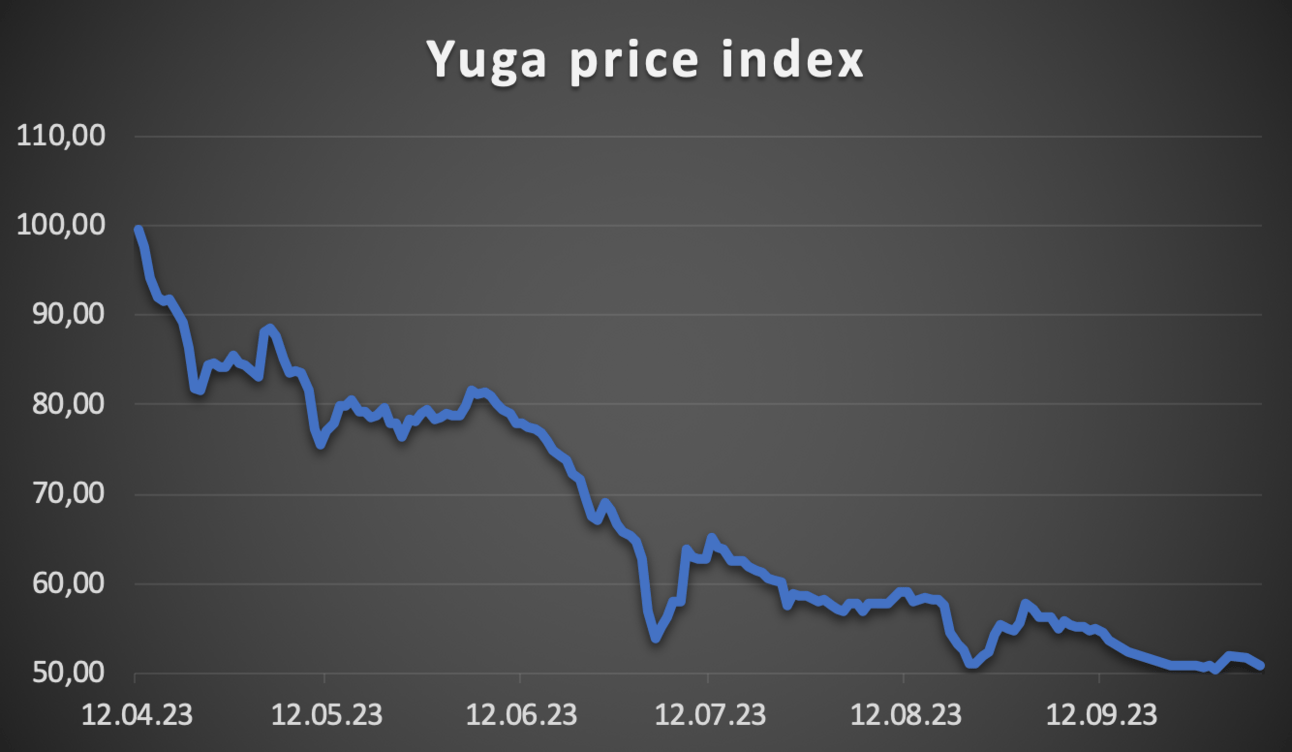 Now, let's talk about Yuga's collections. Since April, the value of Yuga’s collections has dropped by about 50% if we analyse Yuga’s price index (without 10ktf).
